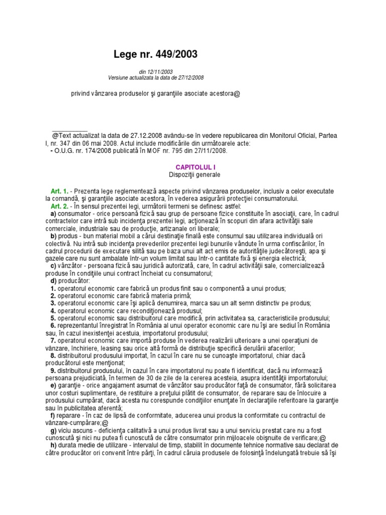 Legea Nr 449 2003 Privind Vanzarea Produselor și Garanțiile Asociate Acestora Lege5 Ro