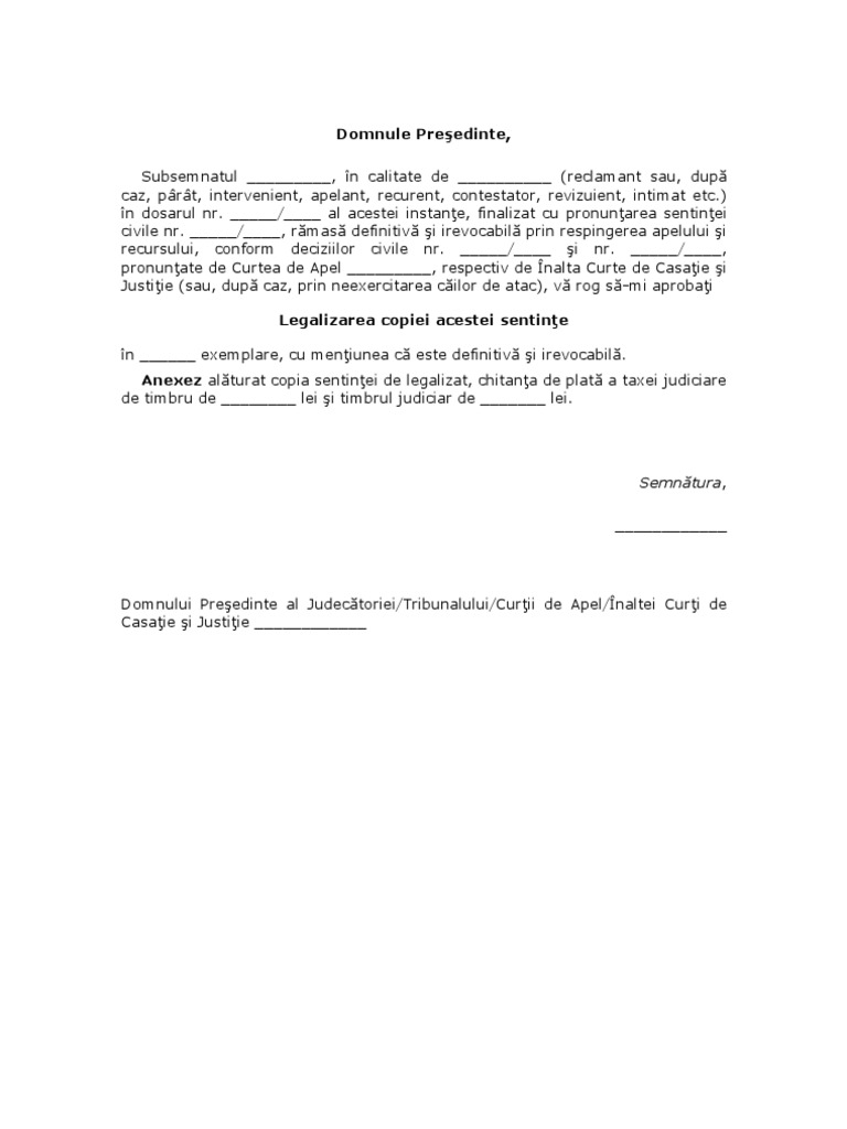 La cerere atasati un exemplar din hotarare si o taxa de 5 lei achitata la cec. Daca doriti sa legalizati mai multe exemplare achitati cate 5 lei pentru fiecare exemplar pe care il doriti si. Cerere de legalizare a copiei unei hotărâri judecătoreşti. Răspunde av adrian cuculis.