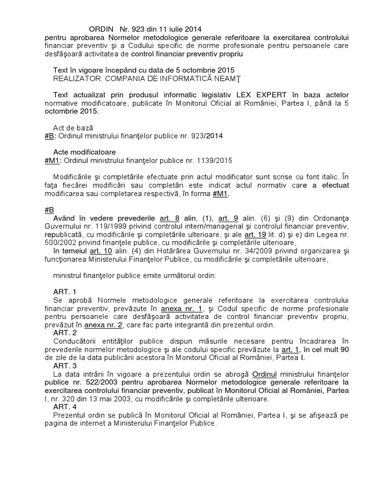 923 2014 pentru aprobarea normelor metodologice generale referitoare la exercitarea controlului financiar preventiv și a codului specific de norme profesionale pentru persoanele care desfășoară activitatea de control. 923 2014 a fost publicat în monitorul oficial al româniei partea i nr. Ministerul finanțelor publice publicat în. 1 139 2015 privind modificarea şi completarea ordinului ministrului finanţelor publice nr.