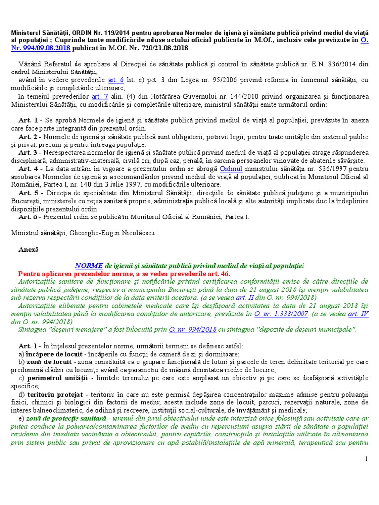 Ordin Nr 119 Din 4 Februarie 2014 Pentru Aprobarea Normelor De Igienă Si Sănătate Publică Privind Mediul De Viaţă Al Populaţiei